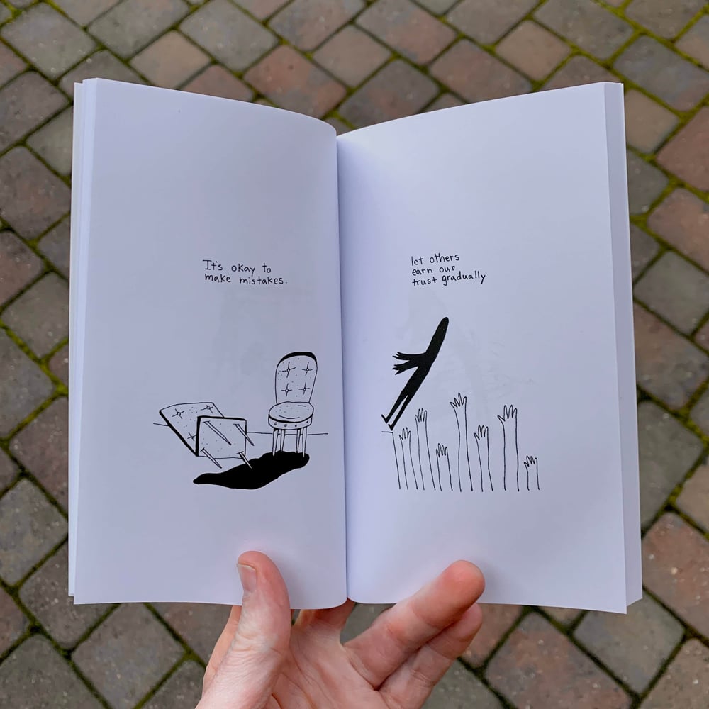 Weird Book is a collection of little drawings from 2013-2018. Most of these drawings were done in bed after a long day of work or therapy. Kyle was going through a lot of personal changes during this time and these doodles are just little glimpses of that growth process.